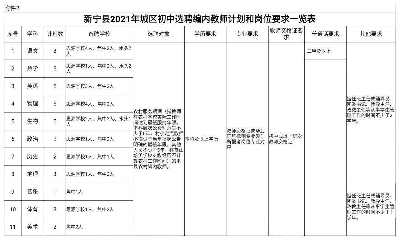 2.新宁县2021年城区初中学校选聘编内教师计划和岗位要求一览表