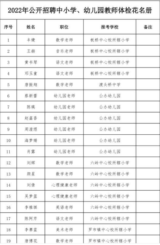 大祥区2022年度公开招聘中小学、幼儿园教师笔试、面试工作已结束,综合成绩已公布。根据《邵阳市大祥区2022年度公开招聘中小学、幼儿园教师公告》,现将体检人员名单公布如下(见附件)。请体检人员凭本人身份证和笔试准考证于8月25日下午18:00前到大祥区教育局607室领取体检通知单,8月26日上午7:30前持有效身份证和体检通知单,到大祥区华夏方圆学校集合参加体检。对未按时参加体检的考生,视为自动弃权。