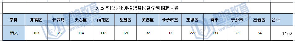 2022年长沙语文学科共计招聘1102名教师,其中属望城区招聘最多,招了222名语文老师,其次是浏阳招聘语文老师133名,岳麓区和长沙县招聘语文老师都在120人左右,市直相对来说招聘人数较少,不过有意向的老师也可以点击咨询了解哦!