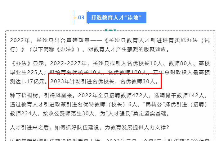 根据长沙县2023年基础教育工作规划,长沙县教育人才引进培育实施办法,2023年长沙县计划引进名优校长、名优教师30人,抓好队伍建设,为教育发展提供人才培养!
