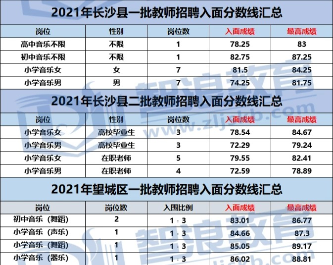 入面分数的话,虽然雨花区总分为120分,其他区均为100分。但是这次入面分数线最高的是望城区二批小学音乐的声乐岗达到了96.3分。最低的是芙蓉区毕业生小学音乐男岗位,为54.68分。